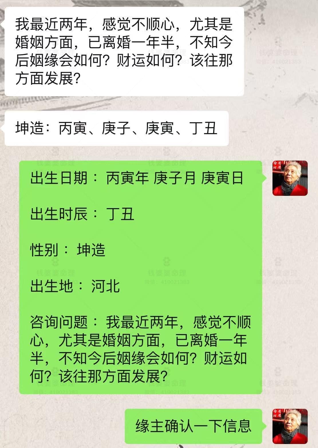 河北女缘主 最近两年,感觉不顺心,尤其是婚姻方面,已离婚一年半,不知今后姻缘会如何?财运如何?该往方面发展?经过缘主同意现将部分批算内容分享给粉丝朋友